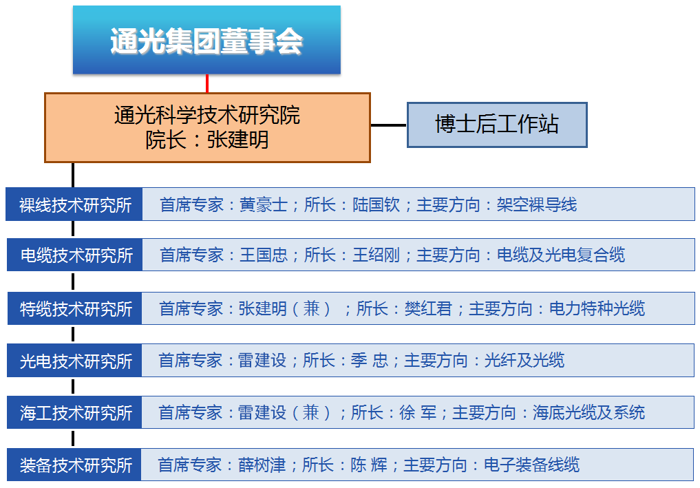 通光科學(xué)技術(shù)研究院下設裸線(xiàn)技術(shù)研究所、電纜技術(shù)研究所、特纜技術(shù)研究所、光電技術(shù)研究所、海工技術(shù)研究所和裝備技術(shù)研究所共6個(gè)研究所,分別從事架空裸導線(xiàn)、電纜及光電復合纜、電力特種光纜、光纖及光纜、海底光纜及系統和電子裝備線(xiàn)纜為主要方向的研究。